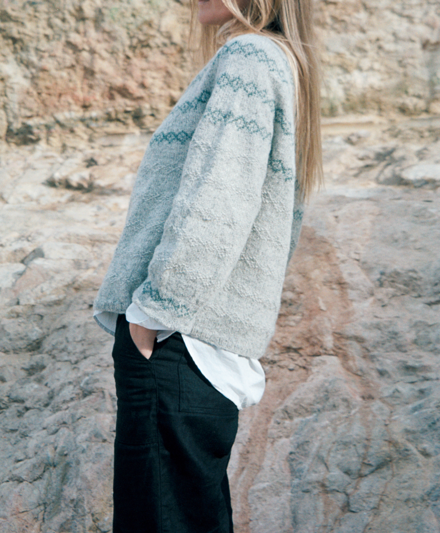 Il est tricoté en jersey endroit avec un motif en jacquard au niveau de l’empiècement et le même motif en mailles endroit/envers au niveau du corps et des manches