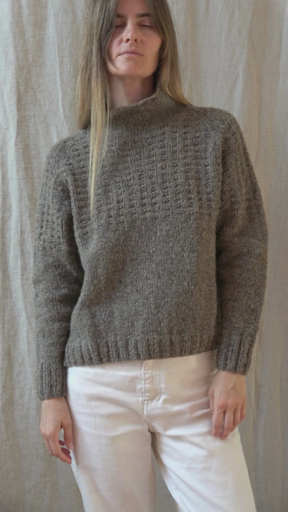 "Pour le pull Biches & Bûches no. 79, je souhaitais créer une forme classique, avec une seule couleur pour laisser place à un jeu de texture qui sublime Le Lambswool. La forme de ce pull est plus près du corps que la plupart de nos modèles (on adore les pulls oversize) avec un col haut élégant et chaud, en choisissant une longueur plutôt courte avec une jolie ouverture sur les côtés.