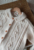 "Le Cardigan Col Athènes est un cardigan à épaules tombantes présentant des textures Aran classiques et ravissantes avec un col aux courbes douces comme point fort principal.