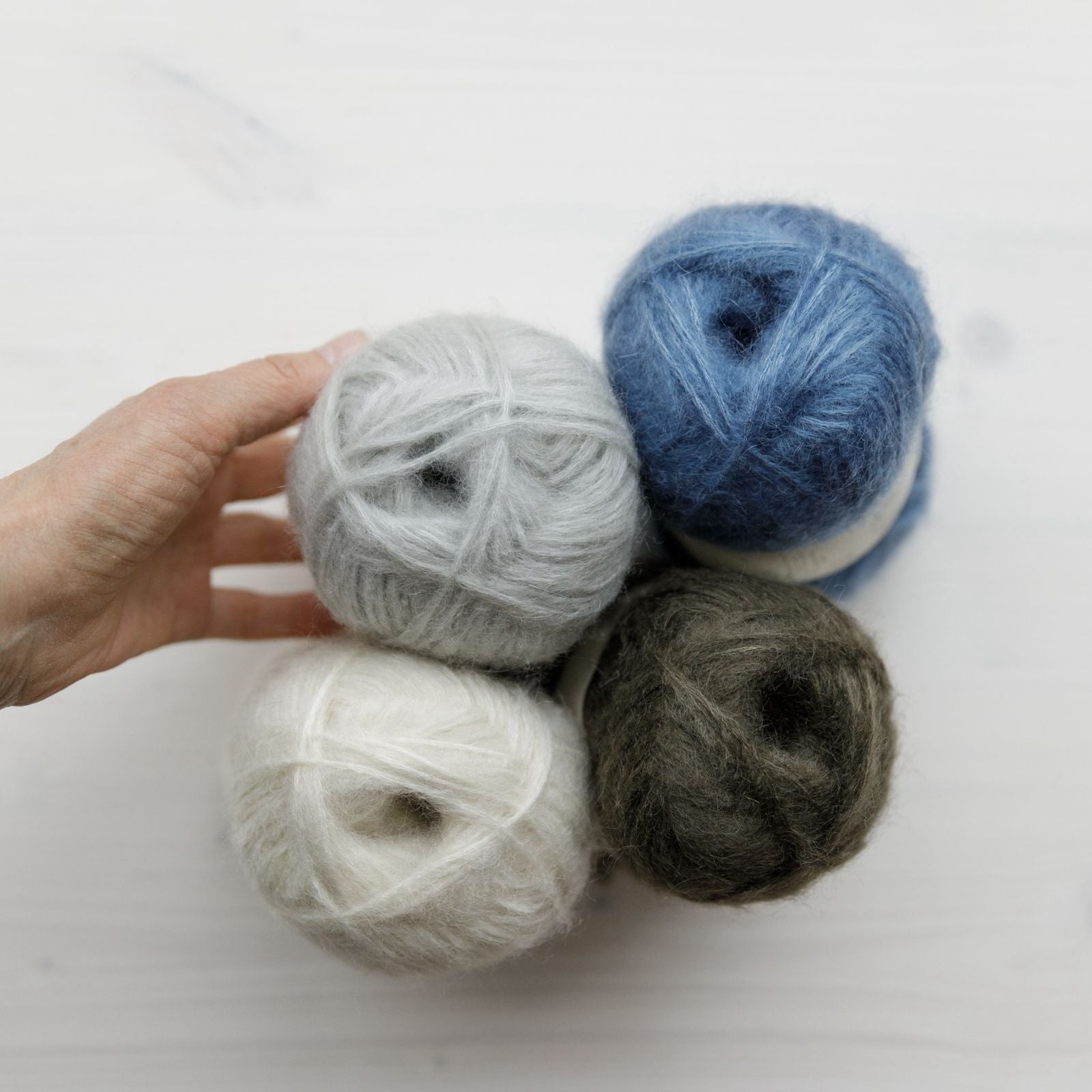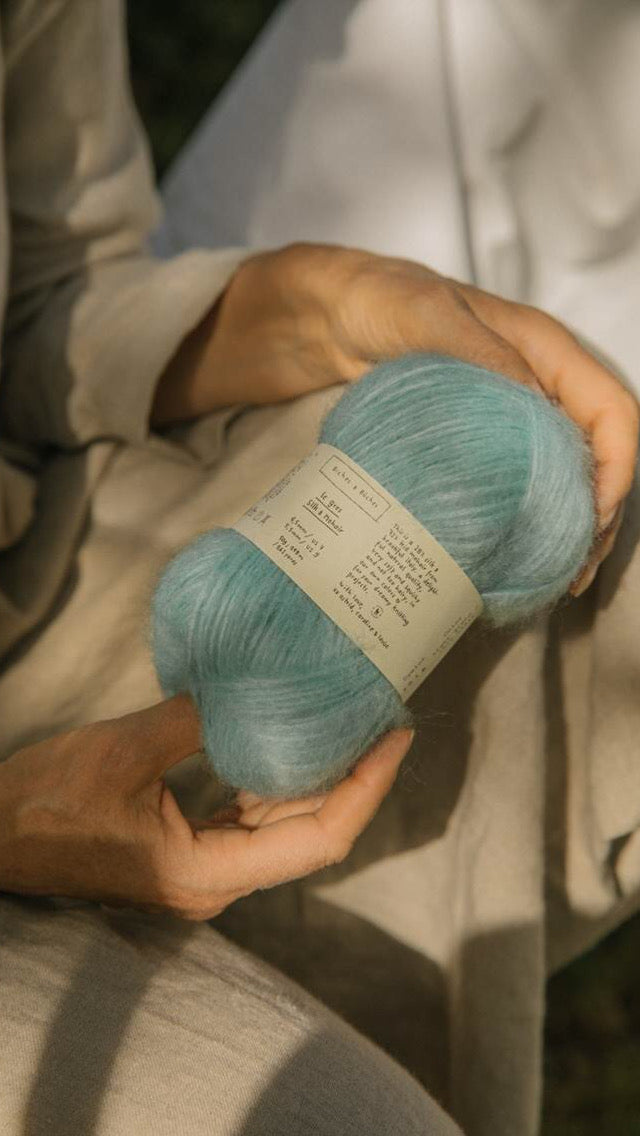 Biches & Bûches Le Gros Silk & Mohair est composé de 28% Soie de Mûrier (Mulberry Silk) + 72% Mohair Super Kid (Kid Mohair) pour cette très belle qualité. C'est le même type de fil que notre Petit Silk & Mohair, simplement bien plus épais, ce qui permet des jeux de textures et des rendus différents.