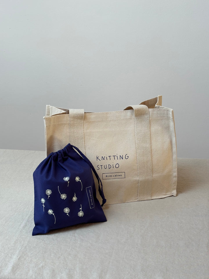 Les deux pochons Bleus Biches & Bûches avec leur motif à fleurs dessiné à l'Atelier 🐚
