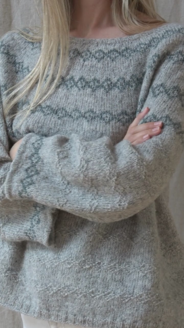 Il est tricoté en jersey endroit avec un motif en jacquard au niveau de l’empiècement et le même motif en mailles endroit/envers au niveau du corps et des manches