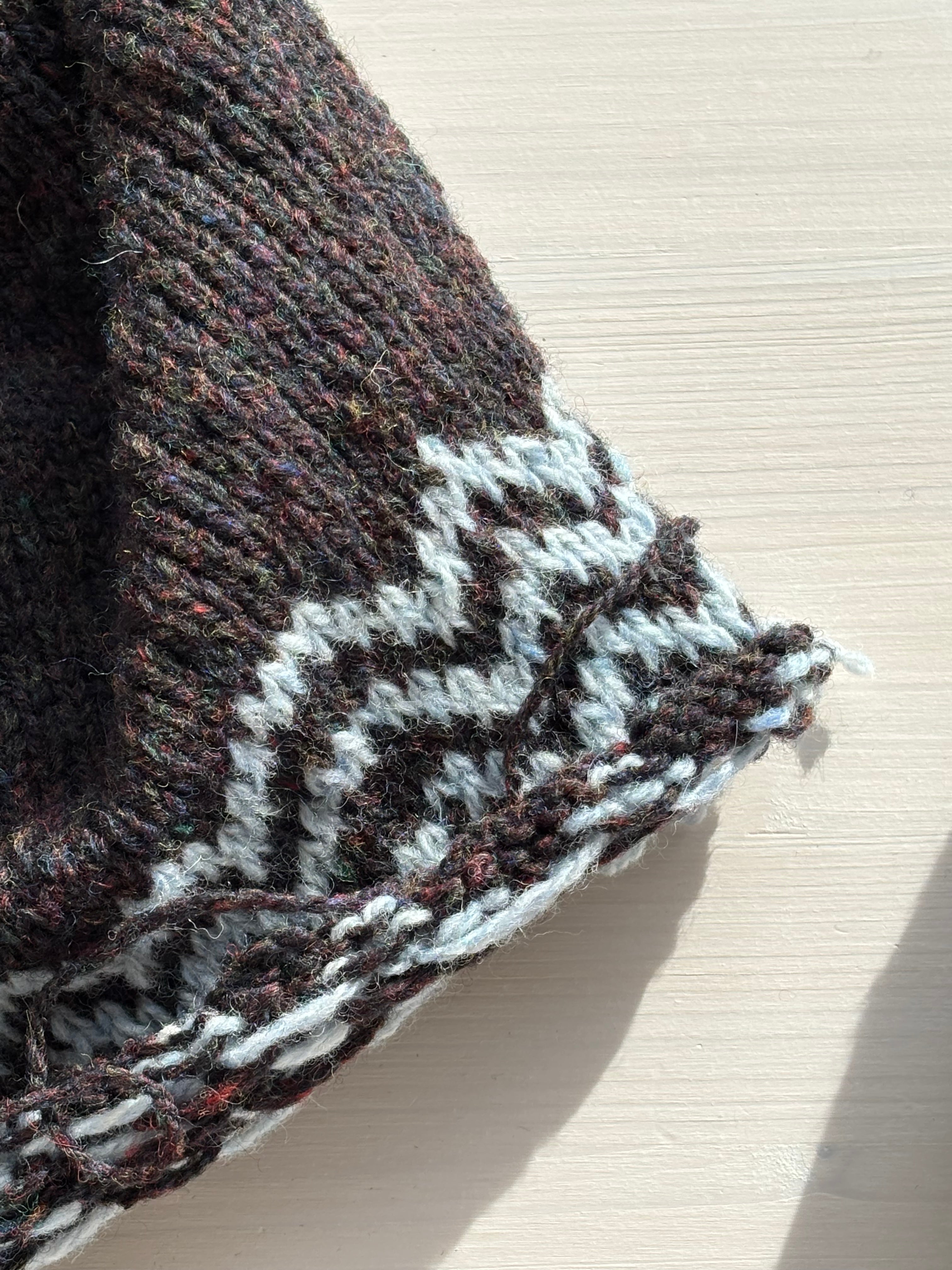 Into the Magic of Knitting with little Isla Shawl in Off White, Dark Brown and Summer Blue